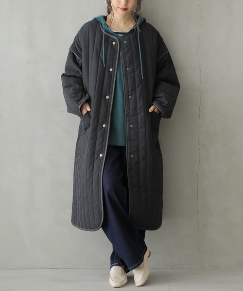 『お洒落の決め手になる、理想的な一着。』 配色パイピングがコーデのアクセントになるノーカラーキルティングコート。 ドロップショルダーでゆるっとしたシルエットが抜け感を演出。縦ラインのキルティングステッチが大人っぽく、すっきり見せを叶えてくれます♪ 柔らかく心地良い肌触りのピーチ起毛生地を使用。パイピング部分はフェイクレザーでモードな印象に仕立てました。 今、好きな物、興味あることを自由な発想で表現できる≪ n'OrLABEL ≫。 「実用性と機能性、そして遊び感覚」、多面性を楽しめるピュアでモードなデザインライン。 お洒落センスに差をつける≪n'OrLABEL≫ノーカラーラインキルティングコートです。