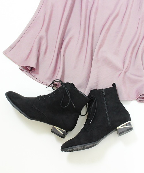 異なるカラーと素材を組み合わせた配色ヒールがポイントの、シンプルなレースアップブーツ。カラーによってヒールの配色も変えたこだわりのルックスで定番のレースアップデザインもセンスup。 程よい高さの3cm太ヒールは安定感も◎ 内側のファスナーで着脱も簡単です♪ インナーには足あたりソフトなウレタン素材を使用しました。 シンプルなデザインで、コーデを選ばずデイリーに活躍してくれます。 ※撮影は室内で行われており、ライティングにより実物と色味が少し異なる場合がございます。