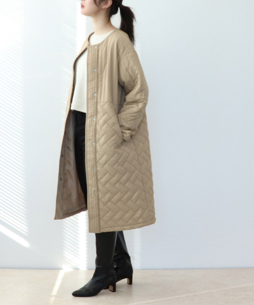 上下でストライプとモザイク柄のステッチで切り替えて表情豊かにデザインされたコート。お顔まわりはノーカラーですっきり。ストールやファーアイテムとのアレンジも映えます。