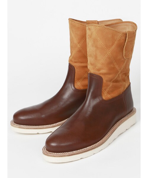 ■ブーツです。ペコスとウエスタンをミックスさせたようなデザインが特徴となります。上下で素材を変え、筒の部分にはステッチワークでオリジナリティを演出。重量感を感じさせつつもソールにはVIBRAM MORFLEXを使用することで見た目に対し軽量な仕上がりとなっています。職人によるハンドメイドに拘った製作も今作のポイントです。