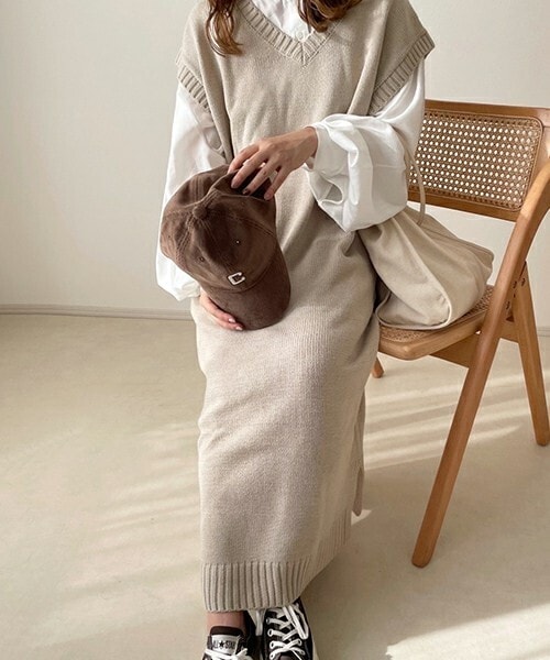 インナー次第でコーディネートを楽しめるニットベストワンピース。 vネックがすっきり大人っぽく見せてくれ、 ロング丈でサイドスリットで抜け感も◎ 1枚でおしゃれに決まるアイテムです♩