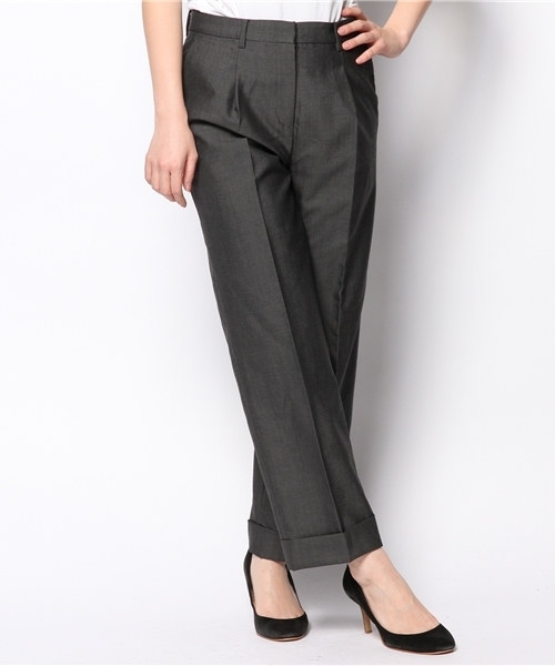 ダブル仕様の裾がマニッシュな雰囲気のワイドパンツです。モヘヤ混紡のウール素材を使用。張りのある質感と微光沢な表面で高級感のある素材感が特徴的です。今年らしい太めのストレートシルエット。タックで立体感を出し、フラットシューズでもすっきりはいて頂ける丈に仕上げました。 Model : H165 B80 W62 H88(cm) Size : 38店舗へお問い合わせの際は下記品番をお伝えください。 品番:68-23-0106-690