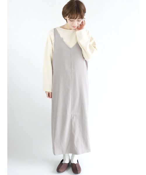 トレンドのスタイリングに欠かせないキャミワンピース。 スエード素材でウォーム感のある、秋冬らしい着こなしが完成します。すっきりとした開きのネックラインで顔まわりをシャープにみせてくれるのもポイント。 取り入れやすいゆったりシルエットの、リラックス感もかわいい1枚です。