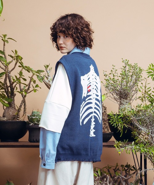 ※多数のリクエストをいただき少量追加生産決定!※限定数に達し次第終了とさせていただきます。前回も好評だったボーンズ柄の12Gのジャガードニットです。今回は両脇が開閉可能な変形ベストの形です。裾リブ端の編み出しはダメージ編みにしております。本体と同素材の丸紐もポイントです。日本人メンズモデル SIZE①を着用身長175cm バスト78cm ウエスト67cm ヒップ89cm女性モデル SIZE①を着用身長160cm バスト85cm ウエスト65cm ヒップ88cmmasterkey洋服の価値が見いだせない時代…解いて、切って、縫って、思案し、又縫って…パズルの様に過去と現在をクロスオーバーさせNew vintageを構築していくmasterkey。自社生産だからこそ派生する”人の手から生み出される温もり””CRAFT感のあるITEM”時がたっても色褪せないwardrobeを創造。ハリスツイードの生地やミリタリーアイテムなどの古着を使用したリメイクアイテムや、ビッグシルエットのアイテムやジャージのセットアップアイテム、ロングコートやスタジャン、スカジャンモチーフもラインナップ。ビンテージのストールを使用したサスティナブルなアイテムも。人気のオマージュシリーズの新作も登場。