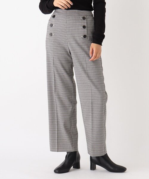 今年トレンドの大人っぽい印象のベーシックなマリンワイドパンツ【素材】ロングシーズンで着用いただけるポリエステルレーヨンにポリウレタンをプラスし、快適な着用感を与える素材です。綾織りの目が立つ表面感がクリアなウールライクな素材でソリッドなネイビーと先染めのグレー系チェックとライトベージュ系チェックの3色展開です。※裏地なし【デザイン】ネイビーにはトレンドのマリンを表現しやすいようゴールドボタンを採用。チェック2色にはカジュアルにも穿いていただけるよう、スコッチボタンを採用し、色違いでも楽しめるディテールをプラスしています。センタープレスを施し、クリーンな印象ながら、後ろウエストゴム、脇はコンシールにし、着やすいデザインに仕上げています。マシンウォッシャブル機能付きでデイリー使いしやすいアイテムです。※ポケット数:横×2、後ろ(ダミー)×2こちらの商品は主に冬に着用いただける商品です。モデル情報:身長163cm B80 W60 H89 着用サイズ:38(M)店舗へのお問い合わせ商品番号:C12-63013●製品寸法:36(S):W60~64cm H84cm 股下66cm 前股上30cm 渡り幅29cm 裾幅23cm38(M):W63~67cm H87cm 股下67cm 前股上31cm 渡り幅30cm 裾幅24cm40(L):W66~70cm H90cm 股下68cm 前股上31cm 渡り幅31cm 裾幅24cm備考: