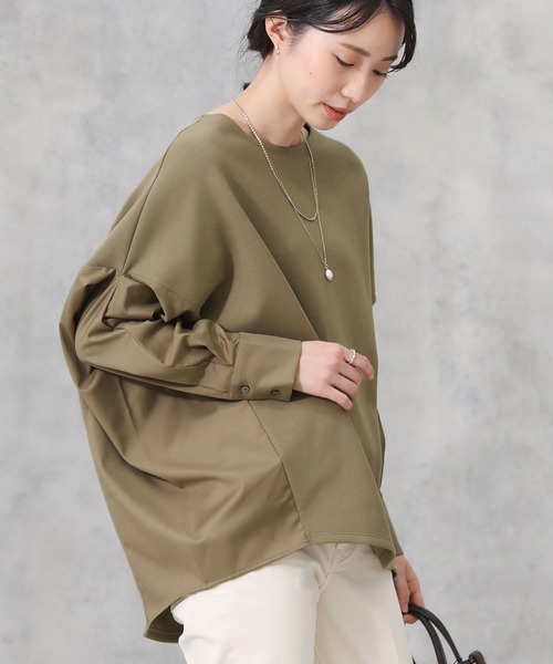 異素材ドッキングと袖デザインがポイントのカットソー。 身頃は軽くてもっちりした肌触りが魅力のソフトダンボール素材、袖にはツイルのシャツスリーブをドッキングしたオーバーサイズのアイテム。 しなやかで着心地のよい素材と、微光沢感のあるルックスが上品な印象を与えます。 袖はバンザイをした様に上に向かって袖付けされた特徴あるディティール。袖を通す事でニュアンス感ある表情に仕上がります。 着回ししやすい丈感も嬉しいポイント。 シンプルにボトムと合わせるだけで、おしゃれなスタイリングが完成します◎ 【ACUTA】アクータ Feminine/Relax/Charming いつも自然体でしなやかな私でいたい 日常を少しだけ「Special」に彩るワードローブ 【 お買い物をもっと楽しんでいただく為に 】 ▼商品のお気に入り登録▼ 完売カラーの再入荷や、ラスト1点、セールの通知をお知らせします。 割引クーポンの発行などお得な情報も! ▼ブランドのお気に入り登録▼ 新商品や再入荷など、いち早くグレディブリリアンのお得な情報を受け取ることができます! 【Gready Brilliant】 「ほどよい存在感」を大切にする大人の女性のためのセレクトショップ。