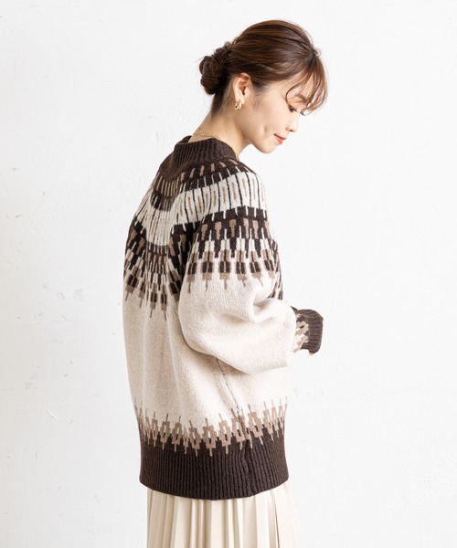 シーズンムード満載なノルディック柄ニット【ポイント】●季節感漂うノルディック柄が魅力のハイネックニット●温かみのあるラテカラーが可愛い配色●首元に集まる柄が目線を上げてくれ、バランス良く見せてくれます●もっちりとした肉厚な生地感で着心地も抜群●絶妙なゆったり感がラフな雰囲気を演出【オススメコーディネート】・ゆったりワイドパンツ合わせで、リラックスムード漂うカジュアルスタイルに・広がりの無いナロースカートを合わせれば、女性らしさを加えた大人コーデに--------------------------------------------------------------生地の厚さ:やや厚手伸縮性:あり透け感:ややあり裏地:なし洗濯方法:ご自宅での手洗い可--------------------------------------------------------------※商品のお取り扱いに関しましては、商品に付属のアテンションカード、洗濯ネームをご覧ください。※撮影場所やお使いのモニター環境により若干お色味が異なる場合がございます。特にロケの撮影では明るく見える傾向にございます。 ※サイト上ではフリーサイズの表記ですが、商品タグにはMサイズと表記されている場合がございます。その場合、ワンサイズでのご用意となりますのでサイズミスなどではございません。詳しいサイズはサイズスペックをご確認いただきますようお願い致します。※サイト上でのカラー名とお届けした商品に記載されているカラー名が異なる場合がございますので予めご了承ください。--------------------《Information》--------------------【商品のお気に入り登録】→カートに入れる右側の【♡マーク】をクリック!完売カラーの再入荷通知やラスト1点の通知、セールの通知を受け取ることができます。【ブランドのお気に入り登録】→ブランドタグのページから【♡お気に入りショップに追加】をクリック!新商品や再入荷など、ブランドのお得な情報をいち早く受け取ることができます。是非ご登録頂き、お買い物をお楽しみください◎<返品・キャンセルについて>・着用・洗濯後の返品は致しかねます。・商品到着後、着用前に商品を確認して頂きますようお願い致します。