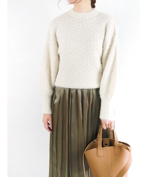 ニュアンス感たっぷりな幾何柄がかわいいシャギーニット。 ドロップショルダーでゆったりとしたシルエットでありながらバルーンスリーブで女性らしい印象に。 キレイ目からカジュアルまで幅広いスタイリングで活躍するアイテムです!