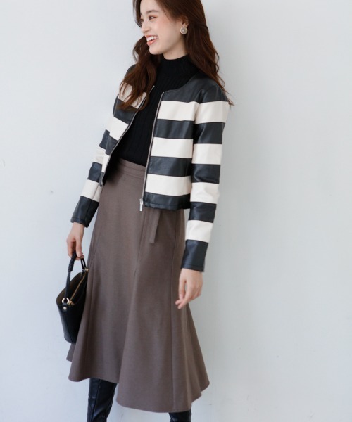 ■デザイン季節の変わり目に一枚あると便利なフェイクレザーノーカラージャケット。程よくボディに沿う細身のコンパクトシルエットなので、女性らしく着ていただけます。■素材柔らかくソフトな合成皮革を使用。ご自宅で手洗い可能。■スタイリングフレアスカートやワンピースに合わせれば、甘さとかっこよさの良いとこ取りのコーディネートに。ロングスカートやワイドパンツとのバランスも◎【透け感】なし【生地の厚さ】普通