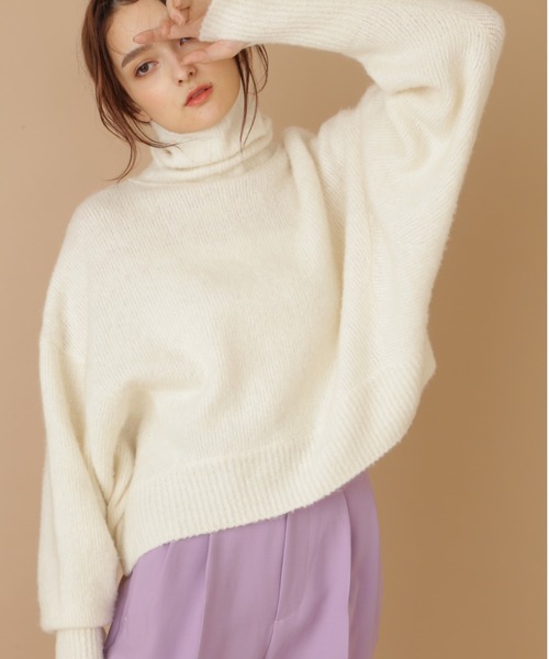 ゆったりとした着心地の良いドルマンニットモヘヤ混を使用したナチュラルでヘアリー感ある素材を使用しています。着丈はやや短めのボクシーシルエットに仕上げ、ハイウエストのボトムとバランス良く着られます。一枚で今季らしいハイネックをポイントにしたスタイルにも、中にシャツとのレイヤードスタイルも楽しめます。細身シルエットのデニムパンツやフェイクレザーハイライズパンツ【店舗品番092-1230010】とのフェミニンな装いに。