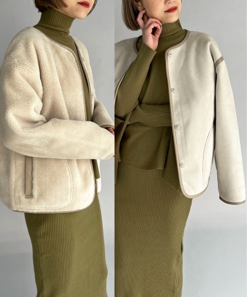2WAYで楽しめるリバーシブルコート。 モコモコと暖かみのあるボア生地と上品見えするフェイクスエード生地を使用。 裏表で違った印象が楽しめる秋冬のマストアイテムです。 ノーカラーデザインなので、タートルやフード付きトップス合わせでも もたつかずにすっきりと着ていただけます。 ショート丈でコーデのバランスも取りやすく、 スカート、パンツとボトムを選ばずに使え、 合わせるアイテム次第で色んなスタイルが楽しめる魅力の一着です。 表側: ボア 裏側: スエード ※撮影場所や明るさにより 実際の商品と色味が若干異なる場合がございます。 ☆商品のお気に入り♡登録を押せば ”再入荷通知”や”残りわずか通知” 値下げのお知らせが届きます! お気に入りのブランド登録していただければ新商品入荷のお知らせも届きますので 是非登録してみて下さい。