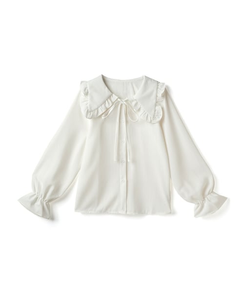 トレンドライクなビックカラーが視線を誘うブラウス。 襟まわりのフリルがや襟元のリボンが愛らしさ満点。 ロングスリーブにゆったりしたシルエットで大人の余裕を見せる。 縦線の入った生地は洗練感を加えてくれる。 ★リボン先は切りっぱなしのデザインです。