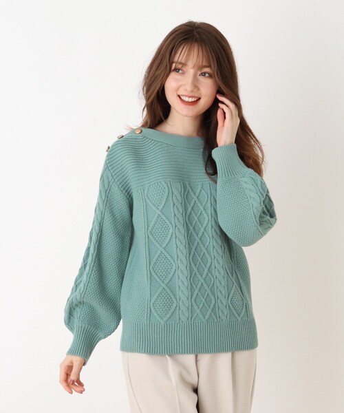 【デザイン】ケーブル編みデザインのニットプルオーバーです。編地変化を付けたケーブル編みが可愛いです。肩に付けた金ボタンがポイントになっています。【生地感】ふっくらと柔らかな肌触りが魅力です。アンチピリング・マシンウォシャブルの機能付きも嬉しいポイントです。こちらの商品は主に冬に着用いただける商品です。モデル情報:身長163cm B81 W56 H82 着用サイズ:02(M)店舗へのお問い合わせ商品番号:741-13089●製品寸法:02(M):着丈58cm B100cm 袖丈49cm 肩幅46cm03(L):着丈60cm B104cm 袖丈50cm 肩幅48cm04(LL):着丈62cm B108cm 袖丈51cm 肩幅50cm備考: