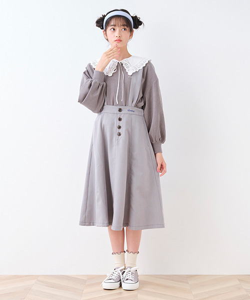 ウサミミのようなサスペンダーがポイントのスカートです。 前の切替とミディ丈のバランスが細見え効果を発揮♪ ベージュとブルーグレーはヘリンボーン素材で上品な仕上がり。黒は大人っぽさがあるので、どれを選んでもおしゃれさんへステップアップ間違いなしです。ウエストはアジャスターゴムでサイズ調節ができます。両側にポケットつき。【おすすめの着用時期は秋シーズン】【透け感】透けない ※ベージュで確認【生地の厚さ】普通【伸縮性】なし【裏地】あり【ポケット】あり【アジャスター】あり