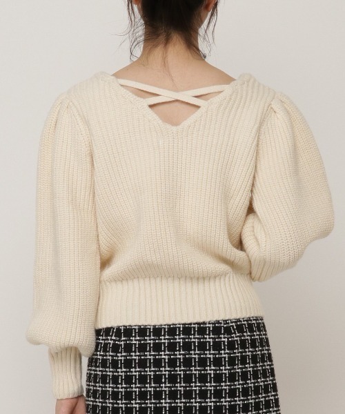 バッククロスがポイントのあぜ編みニット。 シンプルなニットながら後ろがさりげないバッククロスデザインでアクセントに◎ ほどよく開いた首元とポワンとした袖が女性らしさを印象付けます。 ざっくり編みのニットはほどよく抜け感を演出しアンニュイな印象にも◎ 【styling】 チェック柄のスカートと合わせて女性らしい印象に。 デニムやパンツにインしてかっこよいスタイリングも。 -------------------------- 透け感:なし 裏地:なし 伸縮性:なし 生地の厚さ:普通 --------------------------- F:(00):着丈52.5cm 身幅45cm 肩幅33.5cm 袖丈60cm