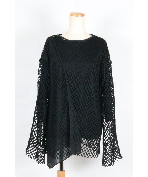 大きめのメッシュが目をひくトップスは、身頃を大胆に斜めに切り替え、右身頃側にシフォンをレイヤードさせたデザイン。衿ぐりと表に出したパイピングがアクセントに。ゆったりとした身幅と程よいミドル丈でカジュアルに着回しやすい1枚。1枚で着用できるようセットしたインナーは7分袖にし、袖口から肌を見せることで、メッシュの存在感をアピール。インナーなしでワンピースやシャツ、カットソーなどに重ねてスタイリングのアクセントにするのもおすすめ。