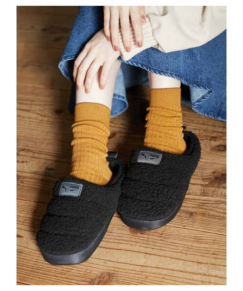 機能性とデザイン性に優れた「PUMA×スカッフシェルパ」。 キルティング素材のアッパーに、裏地にはふわふわのシェルパ付きで素足でも快適な履き心地が味わえます。 アウトソールには滑り止めがほどこされ、屋内外で着用可能な一足です。