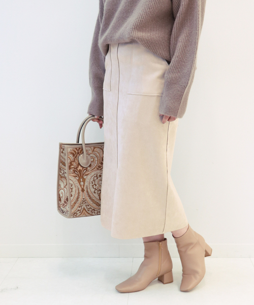 【2021AW】B.C STOCK毎年大好評の名品スカートが登場!高級感のあるフェイクスエード素材は大変ご好評を頂いています◎例年人気のフロントスリットと、アウトポケットデザインを今年も採用。色違いで揃えたい!というお客様のお声にお応えして、今年は使いやすいニュアンスカラーの3色展開にしました!オンオフ兼用で大活躍間違いなしの一枚、ぜひワードローブに加えてみてはいかがでしょうか◎*カラー:グレー(006)はチャコール~ダークブラウン寄りのお色味、カラー:ブラウン(020)はピンクみのライトブラウン、カラー:ベージュ(027)はアイボリーよりの明るいお色味です。**********************透け感:なし裏地:なし伸縮性:ややあり光沢感:なし生地の厚さ:普通**********************【スタッフ着用コメント】《スタッフ staff.s》身長:165cm/普段サイズ:S~M/着用サイズ:Mサイズサイズ感: ウエストとヒップはちょうど良いサイズ感でした、着丈は膝下くらいの着用感でした。素材感:裏地はサラサラとした、中肉のフェイクスエード素材です。シワになりにくく、下着の線を拾いにくいです。着心地: 柔らかく伸縮性があるので、リラックス感のある着心地です。**********************※取り扱いについては、商品についている品質表示でご確認ください。※店頭・屋外での撮影画像は、光の当たり具合で色味が違って見える場合があります。商品の色味は、スタジオ撮影の画像をご参照ください。モデルサイズ:H165 着用サイズ:M本体:手洗い可能