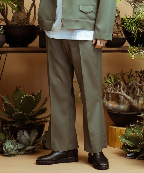 ブーツカットでクロップド丈がお洒落心をくすぐるスラックスパンツです。 鈍い光沢感と程良いハリ感の有るジャージの様な雰囲気も残るポリエステルレーヨンのストレッチ素材を使用する事で軽くて着心地も良く、高級感の有る仕上がりになっております。 シンプルですが、独特な存在感を持ったパンツに仕上がっております。 SET-3 HOOLIGAN-Jとセットアップになります。 日本人メンズモデル SIZE①を着用 身長175cm バスト78cm ウエスト67cm ヒップ89cm 外国人メンズモデル SIZE②を着用 身長177cm バスト85cm ウエスト79cm ヒップ92cm