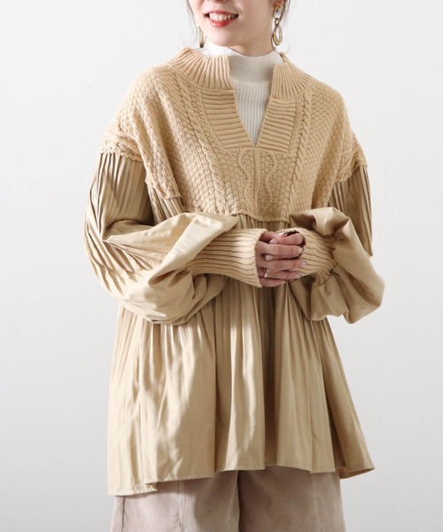 ニットとプリーツブラウスの切替が新鮮* トレンドのミニ丈ワンピースとしても可愛く着こなせます♪ ■point ・冬まで使えるニットと厚手のブラウス生地の切替デザイン ・硬めのプリーツでカジュアルな印象に ・キーネックで首回りすっきり ■detail キーネックのケーブルニットと厚手でパリッとした素材感のプリーツブラウスがドッキング 甘すぎないカジュアルな印象のチュニックブラウスです おしりがすっぽり隠れる長さなので、しっかり体型カバー◎ ぽわんとしたお袖も袖口のリブで引き締めてくれるので、広がり過ぎの心配もなく着ていただけます! ■coordinate インナーにロンTを重ねるとさらにカジュアルな印象に…* 冬場はハイネックのニットをレイヤードするのも可愛いです♪ ショートパンツを合わせるとトレンドのミニワンピとしても着ていただけます また、パンツを合わせる場合は、 プリーツ部分のボリュームが可愛いのでボトムはタイトめなスキニーパンツがおすすめです! ■素材 素材:【表地】ポリエステル 100%【裏地】ポリエステル 100% 洗濯:洗濯可(手洗い) ********** 透け感…ややあり 裏地…あり 伸縮性…なし 光沢感…なし 生地の厚さ…普通 ********** ※撮影場所やお使いのモニター環境により若干お色味が異なる場合がございます。 ■商品のお気に入り登録■ ラスト1点の通知やセール通知、また完売していても再入荷時に再入荷通知を受け取ることができますので、是非ご登録ください♪ ■ブランドのお気に入り登録■ 新商品や再入荷など、お得な情報を受け取ることができます!ぜひご活用ください!
