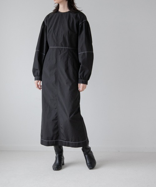 ■素材特性■タテにナイロンのフィラメント、ヨコに綿を用いることで、光沢感と軽さ・合繊合繊しすぎない天然感を兼ね備えた素材です。また、撥水加工も施しており、機能性も持たせています。 ■デザイン■ 配色の糸を使ったステッチワークが特徴のワンピース。袖にボリュームを出しつつも、身頃は体のラインをを意識してすっきりとしたシルエットに。大人っぽい印象のワンピースです。微光沢の素材感が軽さを演出してくれます。 【yuw シーズンテーマ】 なぜか目にとまる静かな存在感のある服。 遠くから見るとシンプルなのによく見るとこだわりを感じる。 さまざまな要素をちょうどいいバランスでシンプルな特別感を表現