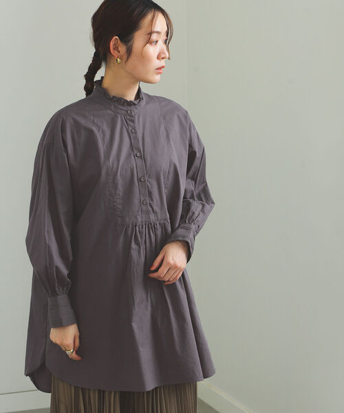 ディテールに拘ったフェミニンチュニック ネックのフリルが印象的なチュニック。ブザム切替やピンタックデザインでヴィンテージ感もありつつ、スタンドカラーで上品さも兼ね備えたひと品です。 バックに施された深めのスリットでコーディネートに程よい抜け感が出るのも魅力。定番のデニム合わせはもちろん、フレアパンツやスラックスを合わせたトレンドライクな着こなしもおすすめです。 【OFF_WHT】Model:H162 Size:FREE 【BLUE】Model:H165 Size:FREE
