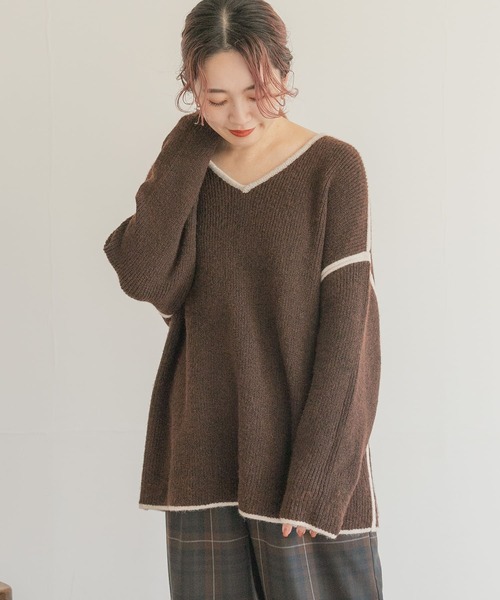 つなぎ目や首回り、裾部分にパイピングデザインを施したトレンドライクなディテールがポイントのニットがNEW IN◎見た目以上に軽やかな着心地と程よくルーズなシルエットがGOOD!柔らかな生地感でちくちく感もなく、レイヤードスタイルもお楽しみいただきやすい1着です♪ ----------------------------- 《スタッフ着用コメント》 [スタッフA] 年齢 : 20代後半, 身長 : 152cm, 体型 : 普通/骨格ストレート 普段の着用サイズ : トップスS~L/ボトムスS 【着用カラー/サイズ】IVO/FREE 【サイズ感】身長152cmだとお尻周りまでしっかりと隠れる長さになりました!深めのVネックで寒さ対策や胸元が気になる方はインナーと重ねても着用しやすいサイズ感になっています◎ 【素材感・着心地】柔らかい素材感でとても軽い着心地です!ざっくりとしたシルエットですが程よい生地感の厚さと軽さで、アウターを羽織ってもゴワつきにくいのが嬉しいです! 【その他】ゆとりのあるシルエットとパイピングデザインが可愛いニットです!ニットパンツと合わせて着用したりとろみのあるスカートと合わせたりする事でさらに今年らしい雰囲気になります◎ [スタッフB] 年齢 : 20代後半, 身長 : 163cm, 体型 : 普通/骨格ウェーブ 普段の着用サイズ : トップスM/ボトムスM 【着用カラー/サイズ】IVO/FREE 【サイズ感】程良いルーズ感で、お尻が隠れるくらいの丈です○身幅にもゆとりがありました~ 【素材感・着心地】柔らかく落ち感のあるニットで、素肌に着てもチクチクしなかったです○ 【その他】パイピングとスカートのGREENを合わせて組んでみました~1枚で着るとVネックで女性らしさがあるので、スカートとの相性抜群です○中にロンTなどを合わせるとカジュアルでパンツと合わせやすくなります! ----------------------------- ※この商品は、素材の特性上ピリング(毛玉)が出来やすいので、連続着用はお避けください。毛玉ができた場合は、毛玉取り器やはさみなどでお手入れください。 ※ハンガーでの保管や着用時に伸びることがあります。あらかじめご了承ください。 ※その他お取り扱いに関しましては、商品に付属のアテンションタグをご覧ください。 ※商品画像は、光の当たり具合やパソコンなどの閲覧環境により、実際の色味と異なって見える場合がございます。予めご了承ください。 ※商品の色味の目安は、商品単体の画像をご参照ください。 ▼お気に入り登録のおすすめ▼ お気に入り登録商品は、マイページにて現在の価格情報や在庫状況の確認が可能です。 お買い物リストの管理に是非ご利用下さい。 ----------------------------- 透け感:なし 伸縮性:あり 裏地:なし 光沢:なし ポケット:なし -----------------------------