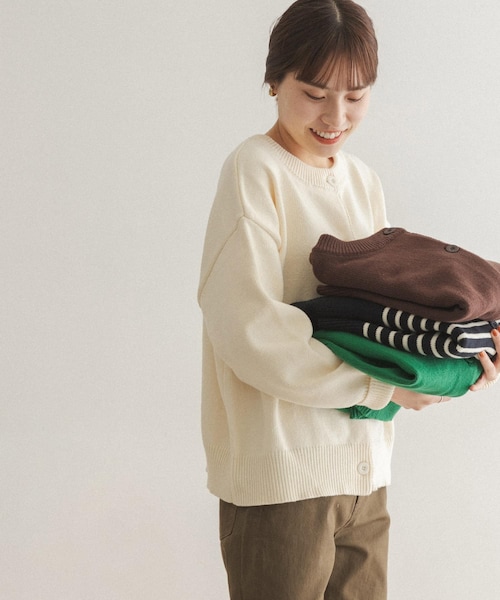 GREENはWEB限定カラーです。定番で着られるコットン×アクリル素材のクルーネックカーディガンは、前後どちらでも着用できる嬉しい2WAY仕様。カーディガンとしての活用はもちろん、ボタン面をバックにするとベーシックなニットプルオーバーにも早変わりし様々な表情が楽しめる万能な一着が完成しました。適度にゆとりをもたせたサイズ感に設定することで中にタートルネックなども着こみやすく、冬のアウターに重ねてももたつきません。ベーシックなスタイリングにうってつけの一着は、ワイドパンツやロングスカート、デニムやチノなどのラフなパンツに合わせても様になります。【FORK&SPOON(フォークアンドスプーン)】DOORSのプライベートレーベル。その名前のとおり「毎日食事を摂るように、毎日大切に着てほしい」という思いが込められています。毎日着たくなる様な心地のよいベーシックスタイルは、世代を超えてお楽しみいただけます。※商品画像は、光の当たり具合やパソコンなどの閲覧環境により、実際の色味と異なって見える場合がございます。予めご了承ください。※商品の色味の目安は、商品単体の画像をご参照ください。透け感:なし伸縮性:ややあり裏地:なし光沢:なしポケット:なし