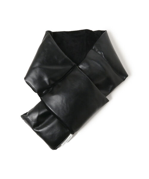 上品な雰囲気を演出するアイテム 品を感じられる光沢がある素材のティペット型マフラー。片面は環境にも配慮した注目度の高いフェイクレザーで、反対側は肌触りの良い合成繊維を使用。中綿入りなので保温性も抜群。片側の筒に通すだけの着用のしやすさも魅力です。