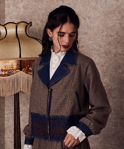 【アイテム説明】ツィード×デニムのブルゾンです。衿、袖口、裾とボディ-の異素材の切り替えが個性的で他と差をつけるブルゾン。ゆったりルーズなシルエットが絶妙なバランスです。ウォッシュ加工、ダメージ加工でカジュアル感を表現。裾部分はaxes femme Nostalgieらしい花柄刺繍を施しました。