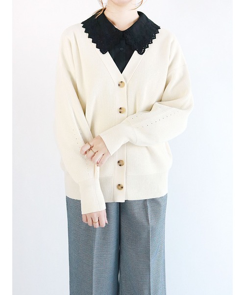 ざっくりとした立体感のある畔編み仕立てのカジュアルなカーディガン。 顔周りを華やかに魅せてくれるVネックとべっ甲ボタンをアクセントに、上品な甘さもプラスしました。幅広な袖と裾のリブでメリハリのあるシルエットも◎ ヒップが隠れるくらいの丈感で、体系カバーにも効果的です。