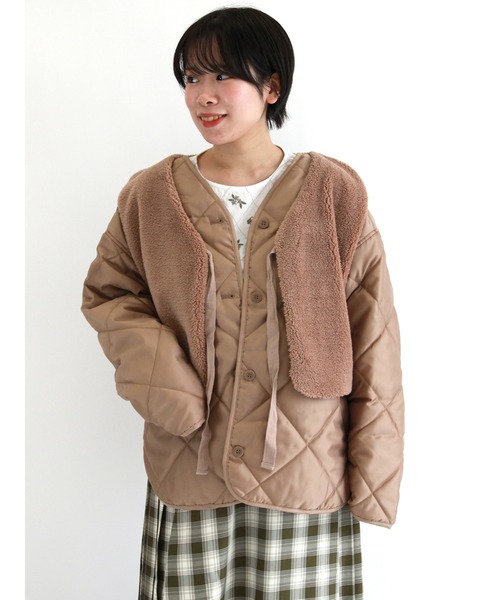 保温性に優れたキルティング素材のルジャケットに、ふわもことしたボア素材のベストという異素材のアウターを組み合わせた今季らしいアイテム。 「カジュアル×フェミニン」の特徴を活かした単品使いやレイヤードコーデとしてトレンド感たっぷりのコーデが楽しめます。 手洗い可、石油系ドライクリーニング。
