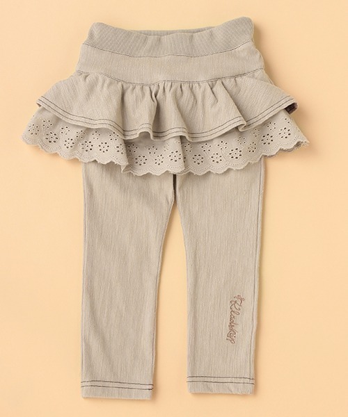 防寒アイテムとしても重宝するロング丈のスカパンです。 スカートの下の段には同色のレースをあしらい、女の子らしさ満点のルックスに♪ ストレッチ性のあるデニム素材で動きやすさにもフォーカスしたアイテム。ブランドロゴ刺しゅうもさりげないおしゃれ感をメイクします。ウエストはアジャスターゴムでサイズ調節可能です。【おすすめの着用時期は冬シーズン】【透け感】透けない【生地の厚さ】普通【伸縮性】あり【裏地】なし【ポケット】あり※フリルの下にポケットあり【アジャスター】あり