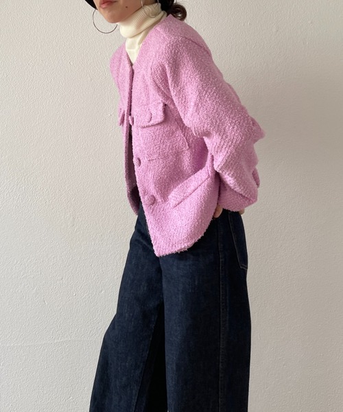 着るだけでテンションの上がるカラフルなツイードジャケットコートが登場!【デザイン】どこかレトロな印象を与えてくれるビッグボタンにダブルポケットデザイン。シンプルなノーカラーで取り入れやすい1枚です。腕周りの窮屈さは本当にプチストレスですよね、、!コンパクトな見た目とは打って変わって以外と身幅、アームホールも広めなお作りに。そんなストレスとは無縁でフリーに着ていられるのも嬉しいポイント!【質感】 ふわっと軽い!まるでカーディガンのようなツイードジャケット。オーバーコートの下にカーディガン感覚で忍ばせても◎!【スタイリングポイント】デザイン性はありながらもワントーンで仕上げているので意外となんでも合わせやすいこちらのジャケット。カラー物のインナーで遊んだりワントーンコーデにまとめたり。デニムやスニーカーのスタイリングにポイントとして持ってきて欲しい1枚です!ーーーーーーーーーーーーーーーー素材: ポリエステル52、ウール40%、アクリル8%生地の厚み:やや厚め生地の透け感:なし生地の伸縮性:なしポケット:あり裏地:ありーーーーーーーーーーーーーーーー
