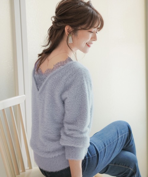 【商品紹介】 秋冬らしい、毛足のあるふわふわ素材のシャギーヤーンでお作りしました。 毛が抜けにくい加工をした素材なので、気になる毛抜けを改善。 前後どちらを前にしても着用OKデザイン。 前後それぞれのレースデザインが華やかエレガントで品の良さUP♡ しっとり質感で落ち感もあるので、 適度なゆるっとシルエットが華奢に女性らしく魅せてくれます。 ---Designer’S POINT--- point1 前後どちらでも着られる2WAY 襟元スカラップ魅せ配色レースで 華奢魅え・華やか・品の良さを併せ持ったニット point2 深めVネックの裏側には安心な共布付きで キャミソールをINしてるかのように着用可能。 デコルテを綺麗に魅せ、繊細で上品なレースを襟元に使用 point3 適度なゆるっと感で身体のラインを強調せず 程よくボディーラインに寄り添うシルエット。 裾はリブ編みでキュッと絞り、 ウエストを細く魅せボトムとのバランスも抜群。 point4 ゆるっとスリーブが抜け感◎ お袖をまくって、お好みの丈に調整も可能。 バルーンスリーブになりすぎないので、 アウター着用時もモコモコせず着やすくなっています。 <ディテール> ・前後2WAY ・ボートネック/深Vネック ・ネックにレースをあしらったデザイン ・開きの大きいネックのレース裏に共布ニットをあて透けを軽減した仕様 ・ボリュームスリーブ ・袖丈/長袖 ・袖口&裾はリブ編み 【マテリアル】 #適度なツヤ感が綺麗 #ふっくらした弾力性 #柔らかなタッチ #ぬめり感のある贅沢な肌触り #素肌にも心地よい質感 #伸縮性あり #フワフワで暖かい 毛足が長く、ふわふわ&しっとり感がミックスしたシャギー素材。 適度なボリュームが秋冬らしい素材感。 素肌に着ても心地よい風合いは贅沢な肌触り。 落ち感があるので、膨らみすぎずシルエットを美しく演出します。 毛が抜けにくいシャギーを加工しているため、気になる毛抜けも安心◎ ※ご自宅で手洗いOK ・厚み/中厚程 ・伸縮性/あり ・透け感/ほぼなし ・裏地/なし ※ニット素材の為、伸縮具合によっては編みに隙間を感じる場合があります。 【お取り扱い上の御注意】 <お届け時のシワにつきまして> ページで着用している商品は撮影前に全てプレスをかけております。 その為お送りする商品は畳みジワや細かいシワがついている場合がございます。 ご了承下さいませ。 <色移り・色落ちについてのご注意点> この商品は摩擦(特に湿った状態での摩擦)や汗や雨などでぬれた時は他の衣料や下着に色が移る事がありますので、十分ご注意ください。 <お取り扱いご注意点> ネット使用 蛍光増白剤使用禁止 単独で洗濯して下さい。 あて布使用 ベルト、バッグ、アクセサリー等との摩擦や引っ掛けにご注意下さい。 洗浄の際に糸が飛び出すことがありますのでネットを使用する等、他の衣類との摩擦や引っ掛けにもご注意下さい。摩擦により毛羽が抜けることがあります。 連続着用は避け毛玉が発生した場合は早めに取り除いて下さい。 濃色は湿摩擦により色が移る場合があります。雨や汗等の湿った状態での摩擦や他の衣類との組み合わせ及びバッグ等の持ちものにもご注意下さい。 自重伸びや外観変化を防ぐためハンガー等に吊り下げての保管は避け、軽く折りたたんだ状態で圧力が加わらないように保管して下さい。 ●個々により多少異なります。 ●強度な力が加われば縫い目が開く等のトラブルが起きる可能性がございます。ご注意下さい。 ●雨や汗で濡れた時は他の衣類等に(特に白物)色移りする場合がありますので色製品には充分御注意下さい。 ●染料や加工を加えた際の臭いが製品に付着している場合がございます。 臭いが気になる場合には、風通しの良い日陰の場所に干して頂けましたら幸いです。 ※商品のカラーは撮影環境・視認性を考慮した色調整を行っておりますが、撮影条件やブラウザ、 パソコンの環境により、実物と異なる事がございます。ご了承くださいませ。