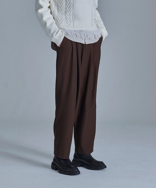 【素材】 柔らかな肌触りと、程よい光沢感が特徴のポリツイル素材で作成。 シワにもなりにくくお取り扱いしやすい素材です。 【デザイン】 キレイ見えする程よいテーパードシルエットが特徴です。 腰回りはアウトタック仕様で素材と相まってキレイに決まります。 また、ベルトループとは別でバックにシャーリングが入っているので履きやすく、履き心地も良いです。 【スタイリング】 ジャケットとの合わせや丈の短いアイテムとの相性が◎です。 テーパードシルエットとの相性が良くきれいでまとまった見え感になります。 - BRAND CONCEPT - 時代を超えて支持されるトラディショナルなアイテムをベースに、アソビ心とストリートの自由な発想を取り入れ、日本独自のミックススタイルを提案します。 ※ポケット数:横×2、後ろ×2 ※裏地なし ※ナチュラル(050)はやや透け感があるため、インナーの着用をおすすめします。 こちらの商品は主に冬に着用いただける商品です。 モデル情報:身長187cm B90 W86 H99 着用サイズ:03(L) 店舗へのお問い合わせ商品番号:170-73305 ●製品寸法: 01(S):W70cm H122cm 股下63cm 前股上32cm 渡り幅38cm 裾幅21cm 02(M):W74cm H126cm 股下65cm 前股上33cm 渡り幅39cm 裾幅21cm 03(L):W78cm H130cm 股下67cm 前股上33cm 渡り幅41cm 裾幅22cm 備考: