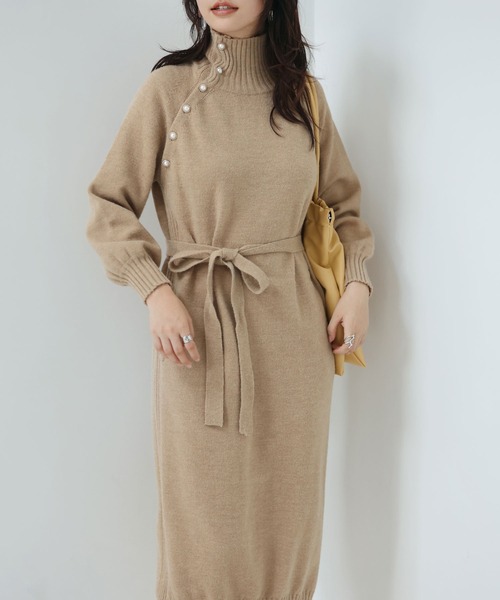 体型カバーとスタイルアップが同時に叶うコクーンシルエットのハイネックニットワンピース。リラックスシーンにもピッタリの、大人のカジュアルワンピースです。首元は斜めボタンデザインで、いろんな着こなし方を楽しめるリブ切替のハイネック。脇身頃から続くボタン付きで開閉も可能なので襟のように倒して首元のデザインを変えられます。体のラインを拾わない身幅のあるコクーンシルエットです。丸みを帯びたフォルムで気になるボディラインもすっぽりとカバーしてくれます。ウエストラインは取り外し可能なリボンベルトで縛ればウエストシェイプされたシルエットに。