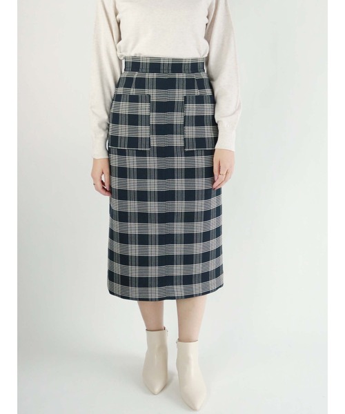 今季らしいカラーのチェック柄タイトスカート。 やさしい表情を印象づけるニュアンスカラーのチェック柄とポケットがアクセントになります。 膝下丈のタイトシルエットで、縦のラインをほっそりと見せてくれるデザインです。 バックウエストはファスナー仕様、ニットやブラウスをINスタイルもすっきり見せてくれます。
