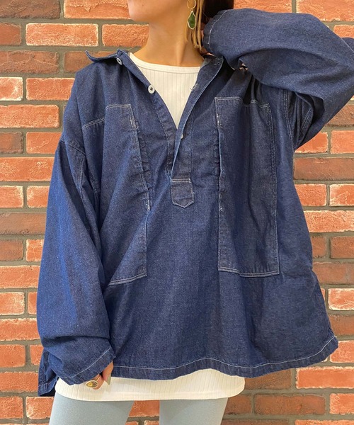 ライトオンスのインディゴデニムを使用したプルオーバーシャツ。 1930年代のU.S.アーミーのデニムジャケットをベースに、オーバーサイズシルエットに仕上げました。 ヴィンテージのような加工を施した豊かな表情が魅力です。両胸の大きなパッチポケットは、センターから手が入れられ中の物が落ちにくい作りになってます。 両脇にもポケットあり。※掲載されている画像はすべて、お客様のお使いのモニターにより、 実際のものと素材感・色が若干異なって見える場合がございます。予めご了承くださいませ。