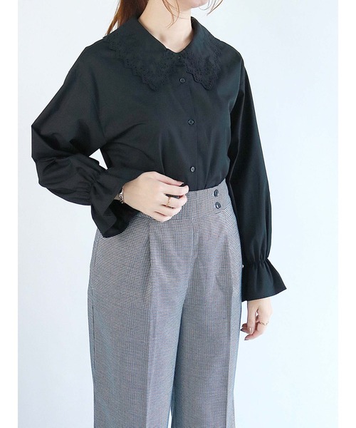 衿に施した、繊細なアイレット刺繍レースが魅力のシャツブラウス。 すっきりとしたシンプルなフォルムが、よりディテールを引き立てます。 きゅっと絞った袖のデザインでさらにフェミニンなムードをオン。 大人っぽくもガーリーにも着られる、様々に活躍するアイテムです。