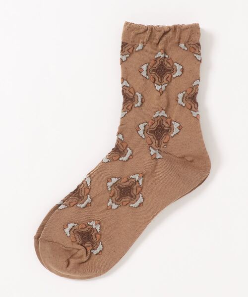 ヴィンテージ感のある可愛らしい幾何学花柄ソックスです。 おしゃれは足元からと言うように、これかの時期の重い印象になりがちなコーディネートにポイントで入れて抜け感を出すのにおすすめです。 スカートやボトムスからチラリと見せるコーデで遊び心のあるおしゃれを楽しんでみて◎
