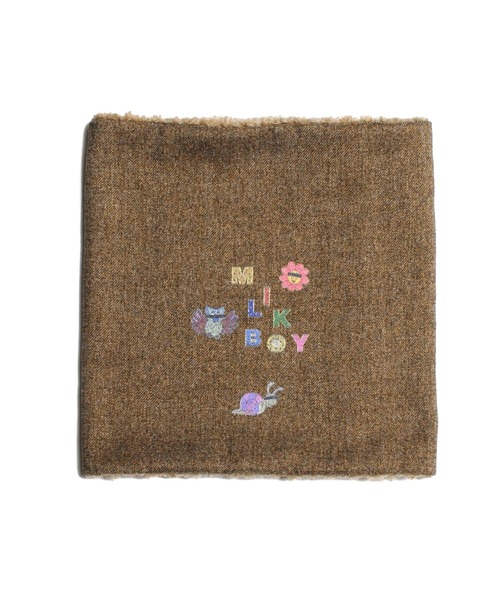 カラフルなイラストプリント入りスヌード。 裏地はボア素材で抜群の保温性◎ A,ベージュ B,クロ