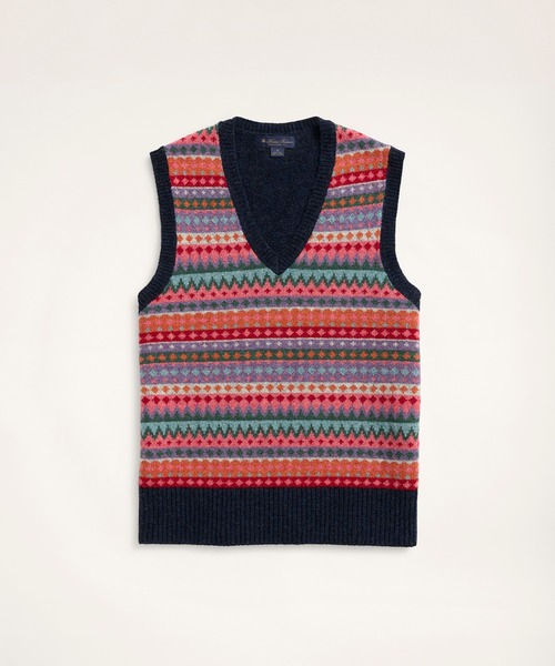 定番のVネックベスト・ポップな配色で仕上げたフェアアイル柄・背面と裾まわりをネイビーで切り替えたアイテム・シャツやジャケットのアクセントに◎フェアアイル柄のVネックベスト伝統的なフェアアイル柄をポップな色調で編み込みました。背面とリブはネイビーで仕上げたコーディネートのアクセントになる1枚です。