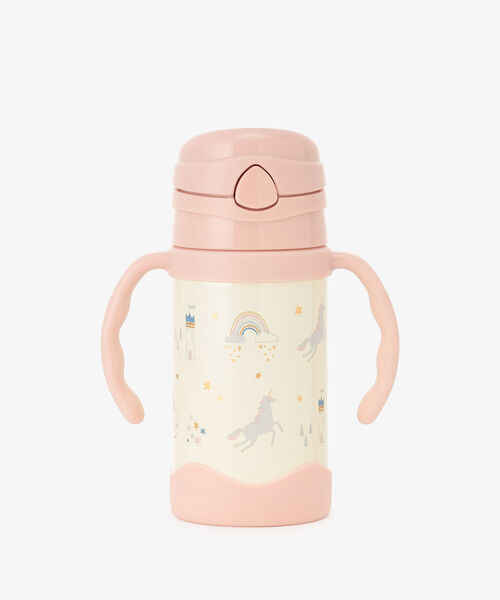 やさしい雰囲気のレインボーをデザインした保冷専用ステンレスマグカップです。内側と外側の間は真空になっており、熱が伝わりにくいステンレス2層構造。ストローやパッキンは取り外せるので、それぞれ個別に洗えて衛生的。フタは片手でも開けられるワンプッシュの手間なし仕様です。ハンドルはほのかに波打つ形状にしており、お子さまの手に馴染みやすくグリップ力を高めます。飲み口は交換用にスペアを1個付け、急な紛失時にも安心。バッグの中でも場所を取りにくい、大きすぎない約280mL容量です。おうちではもちろん、お出かけ時の水分補給をスムーズにアシストしてくれる1品です。 *ディッシュウォッシャー×、電子レンジ× *保冷効力/8℃以下(6時間) *本品は保冷専用です。熱い飲み物は入れないでください。 *バッグなどに入れて持ち運ぶ際は、本体を縦置きにしてください。 *炭酸飲料や牛乳などの腐敗しやすいもの、スープなどの塩分を多く含んだもの、果肉やお茶の葉などは、中に入れないでください。 *塩素系漂白剤、アルカリ性、オレンジオイル系洗剤のご使用はお避けください。 *1点ごとに柄の出方が違うことがあります。 *容量280mL