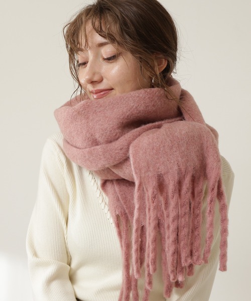 ボリューム感抜群な無地ストール。ふんわりとした風合いに大振りなフリンジがアクセントになります。ぐるぐると無造作に巻くだけで暖かみを感じられ、小顔効果を期待できそう。デイリースタイルのポイント使いにオススメです。