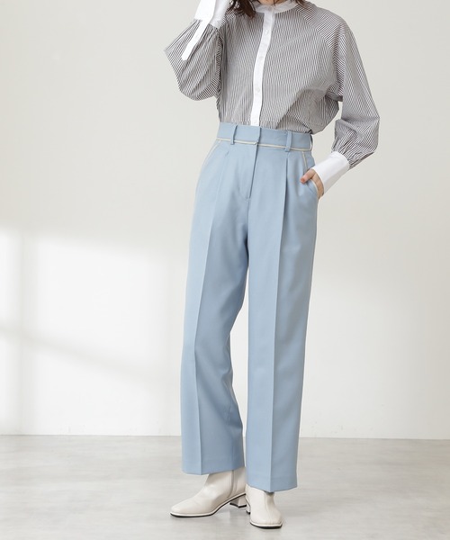 バイカラーのパイピングがアクセントになるストレートパンツ。合皮素材の配色パイピングをウエストベルトとポケット口に施したデザインです。センタープレスをあしらったストレートラインで脚をすっきり見せてくれます。シャツやブラウス、ニットまで着回しできるシンプルなデザインです。今季らしい色展開で揃えており、カラーコーディネートを楽しめます。