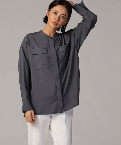 【デザインポイント】折り返しフラップポケットがポイントのバンドカラーシャツ。少しオーバーサイズに仕上げているので、こなれた印象に見えます。羽織りのインナーに着た時にデザインポケットがちらっと見えてポイントに。フロントは比翼ボタン仕様で、ミニマムに仕上げています。裾はラウンドカットでインでもアウトでも決まります。【サイズ感・パターンの特徴】前明きはスッキリとした釦が隠れる比翼明きになっています。【素材の特徴】ソフトでドレープのきれいなレーヨンに、モノフィラの光沢感と程よいハリ感がある生地で、とろみとハリの絶妙なバランスがあります。シンプルな平織りになっているので、軽くて着心地抜群です。手洗い可能でレーヨンが高混率のため吸湿性もあり、機能性も兼ね備えています。----------------------------------洗濯方法家庭洗濯:液温は30℃を限度とし、洗濯機で非常に弱い洗濯ができる。自然乾燥:吊り干しがよい。アイロン:底面温度110℃を限度としてアイロン仕上げができる。ドライクリーニング:石油系溶剤による弱いドライクリーニングができる。----------------------------------■モデル身長 165cm/着用サイズ M※商品タグに記載されたサイズはヌードサイズです。実際の商品のサイズは商品情報の実寸をご確認ください。※画像の商品はサンプルとなりますので実際の商品と仕様,加工,サイズが若干異なる場合がございます。※お客様のモニター環境により実際のお色と多少異なる場合がございます。※撮影状況や光の当たり具合により,色合いが異なって見える場合がございます。