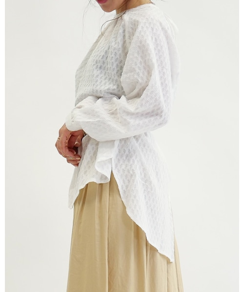 前後やバックのスリットがデザインポイントで、一着で様になるブラウスです。袖口に程よく施したギャザーのふんわりとしたボリューム感が女性らしい印象になります。