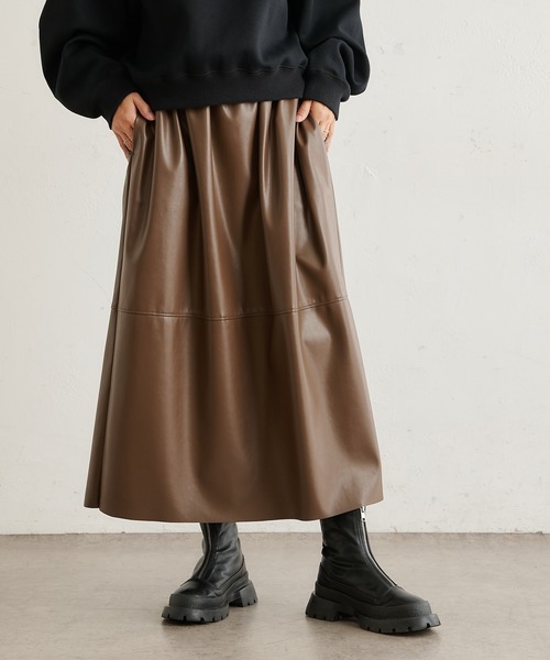 【2021AW】 着ているだけでサマになる素材感のある1枚 ◆デザイン ・フェイクレザーの光沢感がきれいな陰影を演出 ・裾の切り替えを入れることでAラインに広がらず甘くなり過ぎないシルエット ・ウェストの下のギャザーは気になるお腹まわりをカバー ・ウエスト後ろがゴムなのでストレスフリーで着心地抜群 ・両脇ポケット付きで便利さUP ◆素材控えめな光沢感でマットな表情に仕上げた手洗い可能な合皮素材を使用。 ジャージー素材をベースにしており、裏側は非常に肌触りの良い風合いに。 適度な肉感がありながら、ハリ感もあることで軽い着用感を実感いただけます。 ◆スタイリング フェイクレザー素材なので、トップスにカット地やニット地や布帛地と どれをもってきてもしっくり収まりの良いデザイン。 大きく広がりすぎることもないので、ゆるいシルエットからタイトまで 幅広いトップスとスタイリング出来ます。 ◆品質表示◆ 洗濯:‐ 透け感:なし 裏地:なし 伸縮性:なし 光沢感:ややあり ◆商品画像について◆ 店頭及び屋外での撮影画像は、光の当たり具合で色味が違って見える場合がございます。 また、お客様のお使いのモニター環境により、実物と色味が異なる場合がございます。あらかじめご了承下さいませ。 ◆お気に入り登録について◆ ▽気になるアイテムは、ハートマークをクリックしておくことで、スムーズにお買い物が楽しめます。 ・ラスト一点のお知らせ ・再入荷のお知らせ ・予約商品が店頭に入る際にお知らせ ・SALEのご案内