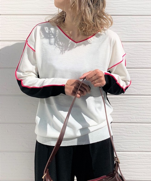 アウトパイピングが可愛いバイカラーニットです。 前後ろで着られる2wayタイプ。 首開きがVネック・Uネックと印象を変えて着られます。 肌触りが柔らかく着心地抜群。 シンプルなボトムスでも一味違ったスタイルにできるおしゃれなニットです。 《インフォメーション》 ◆商品のお気に入り登録 完売していても再入荷時に再入荷通知を受け取ることができますので、是非ご登録ください。 ◆ブランドのお気に入り登録 新商品や再入荷などの情報を受け取ることができますので、是非ご登録ください。